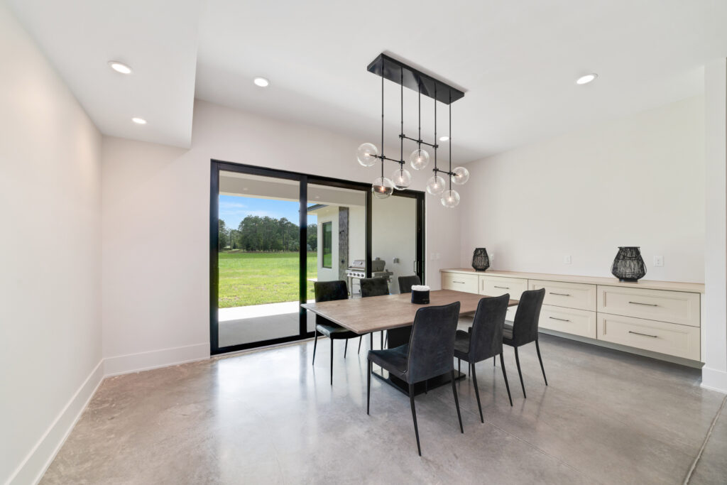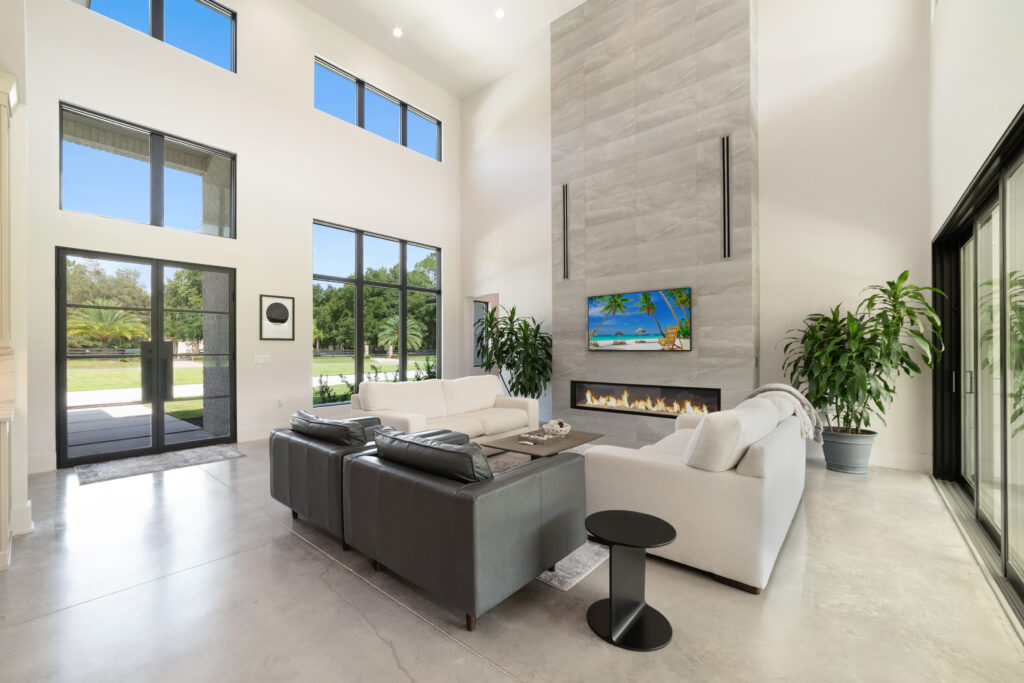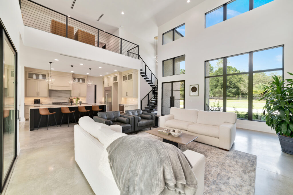 The living room features 22 ft ceilings, an open floor plan into the kitchen, and the second floor above, providing a stunning entrance to the home. The modern stairwell featuring Viewrails modern cable railing and a 100″ Woodland Linear Electric fireplace – providing the convenience of an electric fireplace while incorporating the appeal of modern linear gas units. Sliding glass doors open to the back porch, providing plenty of natural light and perfect for inviting the outdoors in through your living room.